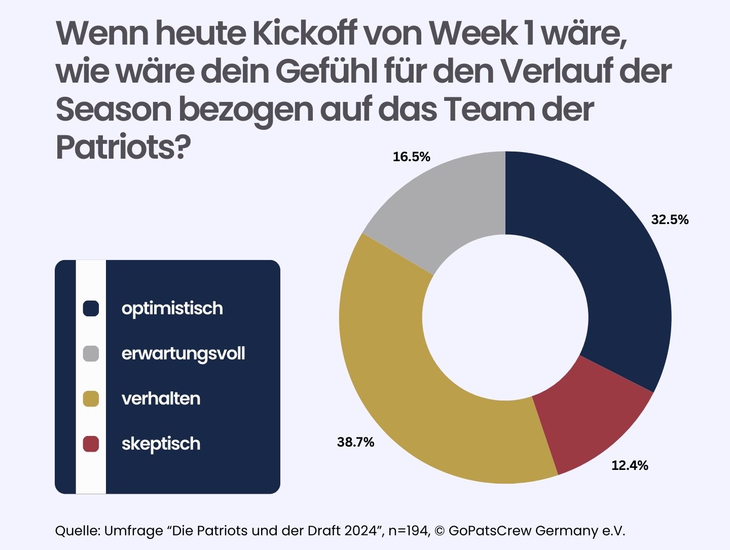 Wir wollten es genauer wissen und haben eine Umfrage zu eben diesem Thema gestartet. Acht Fragen standen zur Disposition, die in einem Zeitraum vom 28. bis 30. April 2024 beantwortet werden konnten. Insgesamt 194 Patriots-Fans aus der DACH-Region haben daran teilgenommen und einen Einblick in ihre Gedankenwelt gegeben.