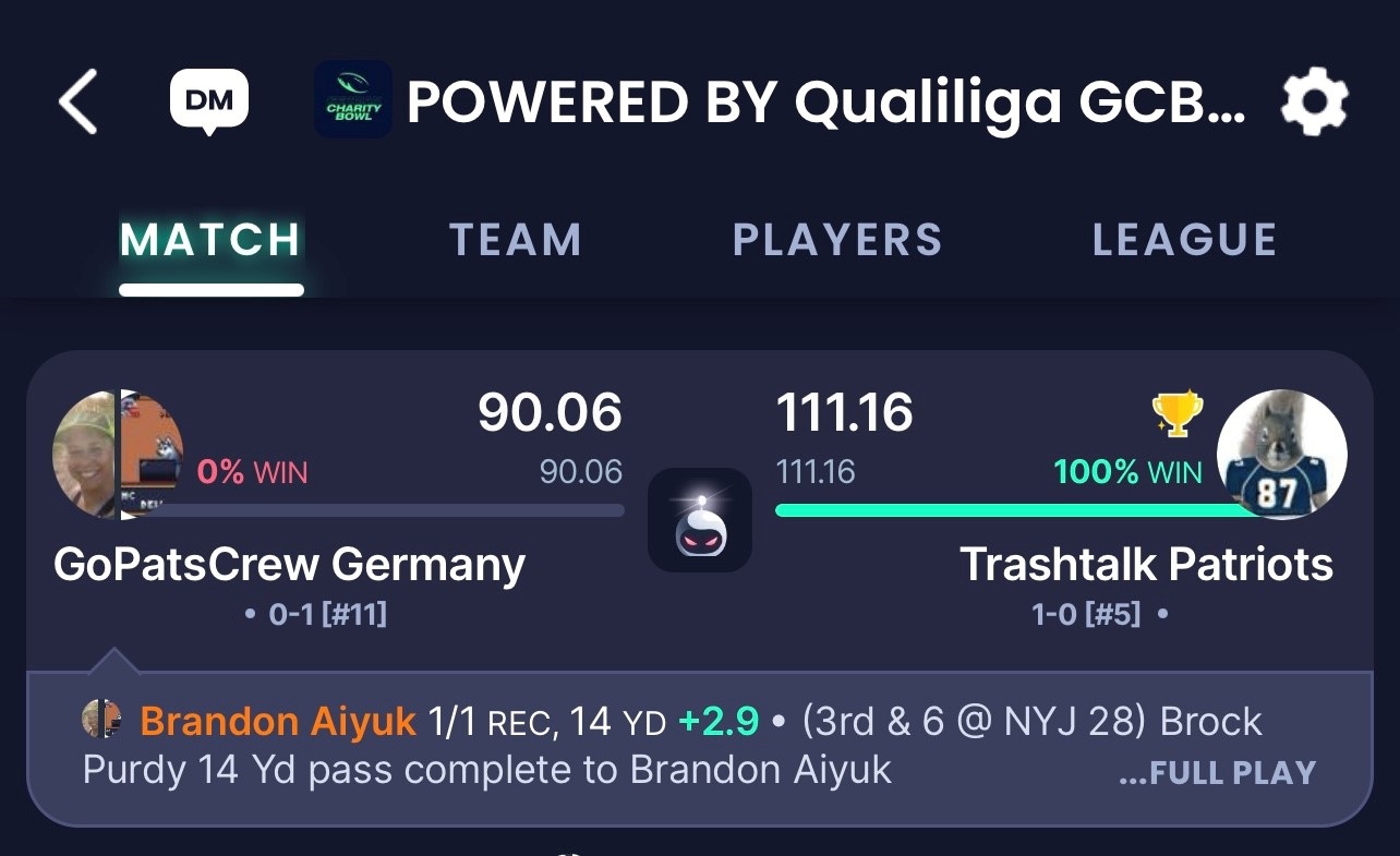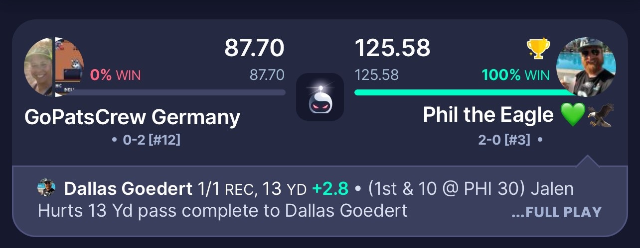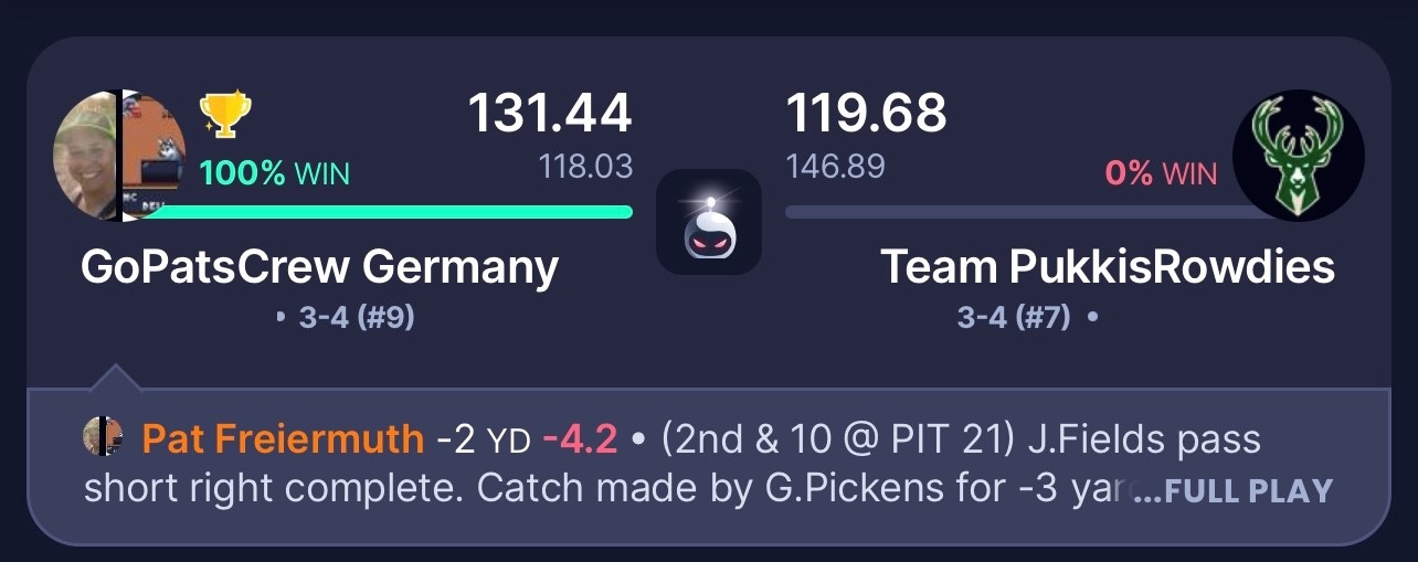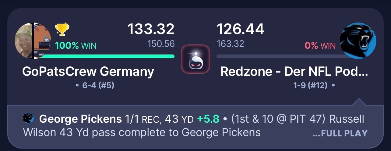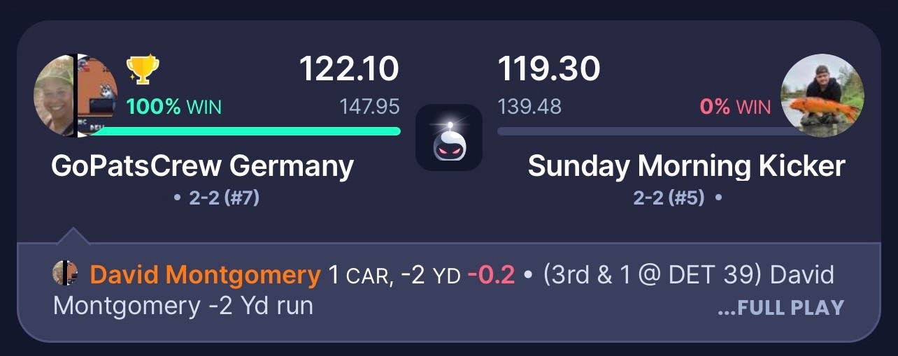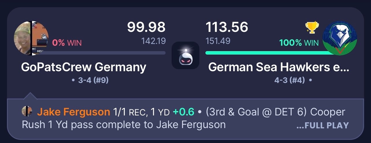 Glücklicherweise konnte ich früh hoffen, dass ich gute Chancen auf einen Sieg hatte. WR Stefon Diggs, RB David Montgomery und TE Jake Ferguson überzeugten dabei besonders und trugen mit knapp der Hälfte meiner Punkte maßgeblich zum Erfolg meines Teams bei. Dadurch konnten schwächere Leistungen anderer Spieler wie QB C.J. Stroud und WR Brandon Aiyuk kompensiert werden.