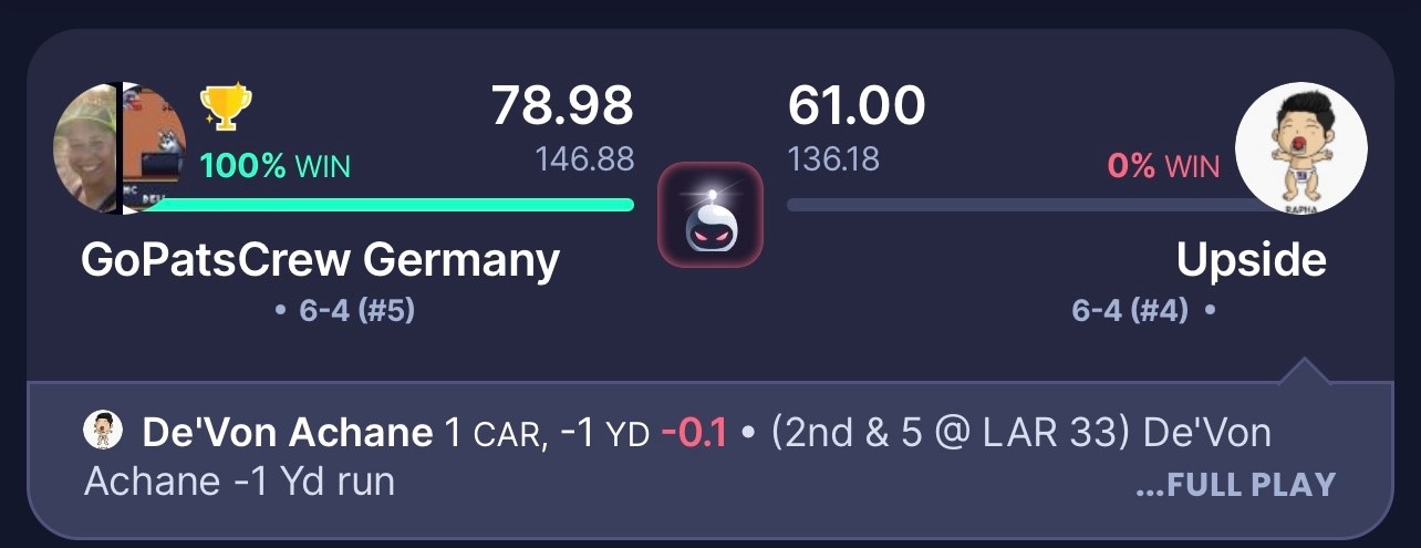 Am Ende entschied es in gewisser Weise RB De‘Von Achane, der im Monday Night Game auf lediglich 10.70 von 23.50 Projected Points brachte. So konnte ich am Ende einen Sieg einfahren – es waren zwar nur magere 78.98 Punkte, doch Upside war mit 61.00 Punkten sogar noch schlechter.