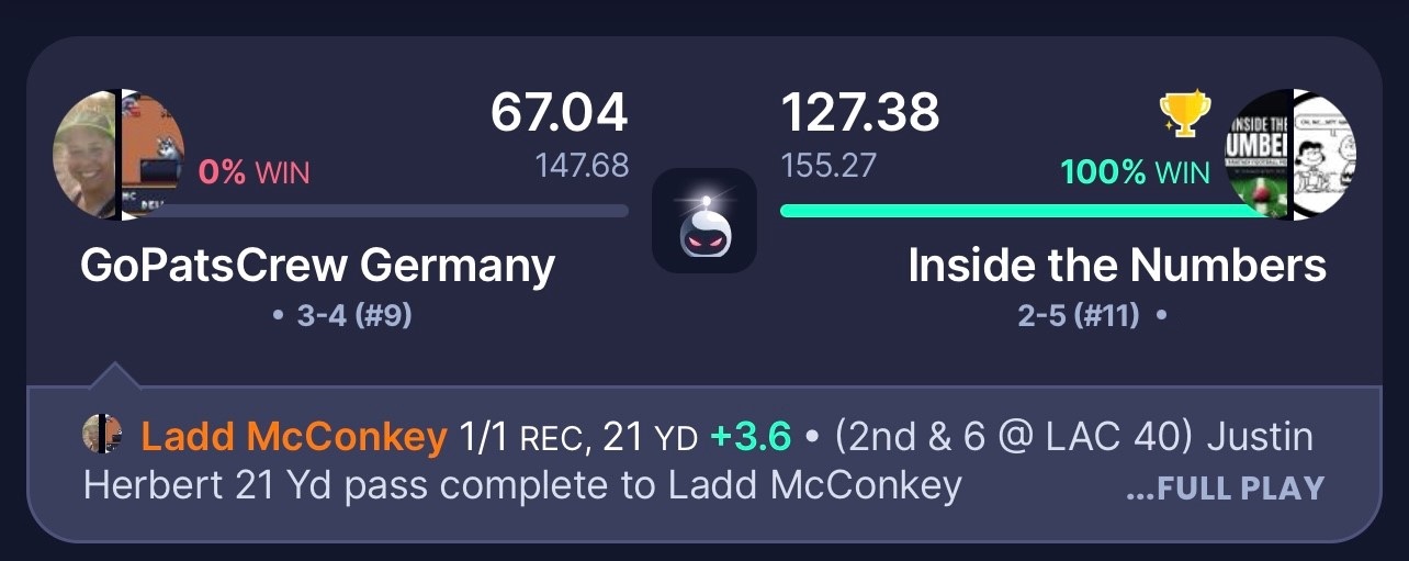 Gestartet bin ich mit einem Projected Lose gegen die Trashtalk Patriots. Doch schon das erste Spiel (Chiefs vs. Ravens) spielte mir in die Hände. Denn TE Travis Kelce, den die Trashtalker gepickt hatten, konnte nur 8.40 Punkte von 19.62 Projected Points einstreichen. Das hatte zur Folge, dass ich am Freitag leicht zulegen konnte und eine 52-prozentige Win-Wahrscheinlichkeit hatte.