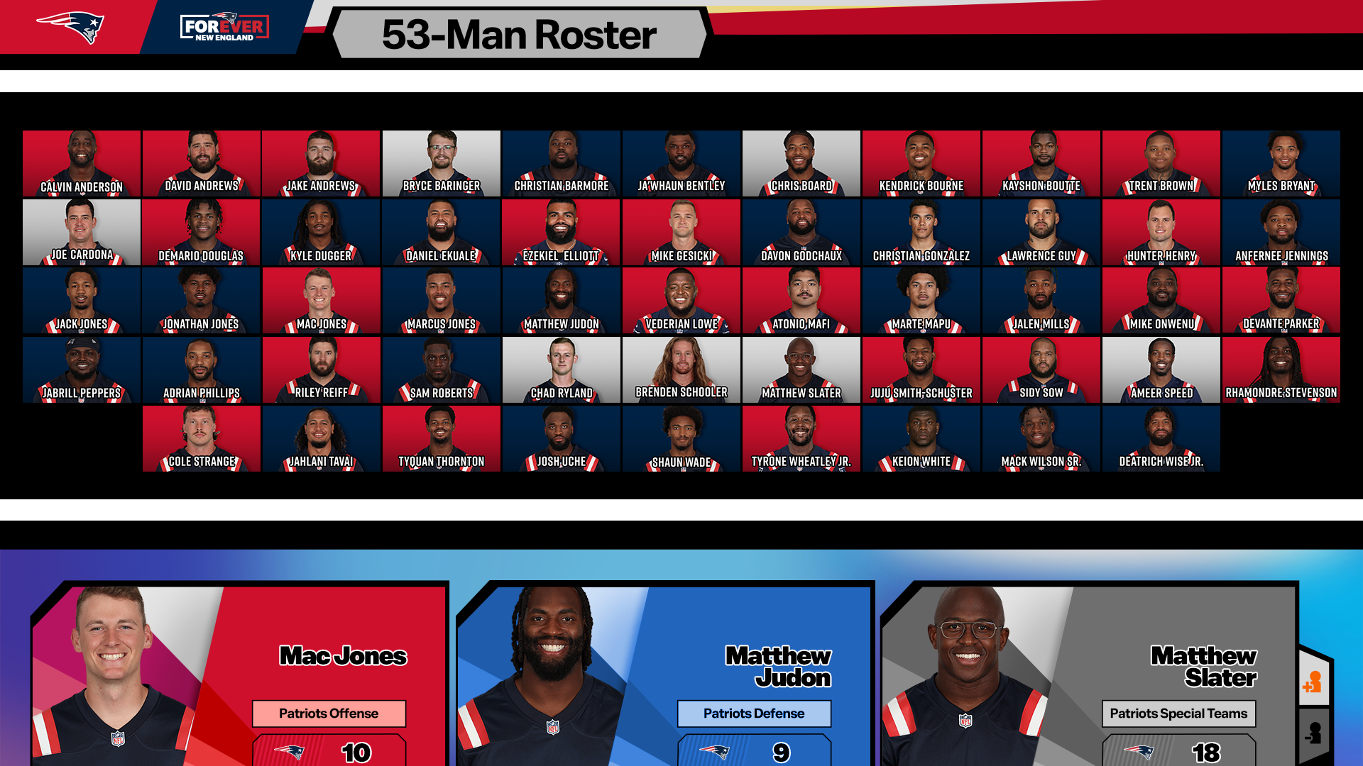 DL Christian Barmore - Knee, OT Trent Brown - Concussion , CB Jonathan Jones - Ankle, OL Mike Onwenu - Ankle, WR DeVante Parker - Knee, OL Sidy Sow - Concussion, G Cole Strange - Knee